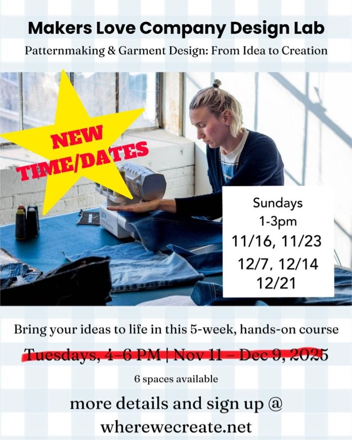 Makers Love Company Design Lab | $275 (materials not included)Discover the art of translating your ideas into wearable form. This 5-week, hands-on course invites intermediate and advanced sewists to explore the patternmaking process from concept to finished garment. Together, we’ll learn to see clothing as both craft and design — shaping pieces that fit our bodies, tell our stories, and express our creativity.