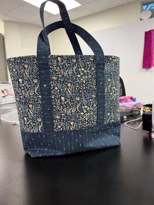 The shop sample has decorbond for the handles only and for a stiffer bag body I used Decovil light. If you would like this option and the larger handles buy 1/3 yard of decorbond and 1 ¼ yd of the 36-inch wide Decovil light (on the roll).
